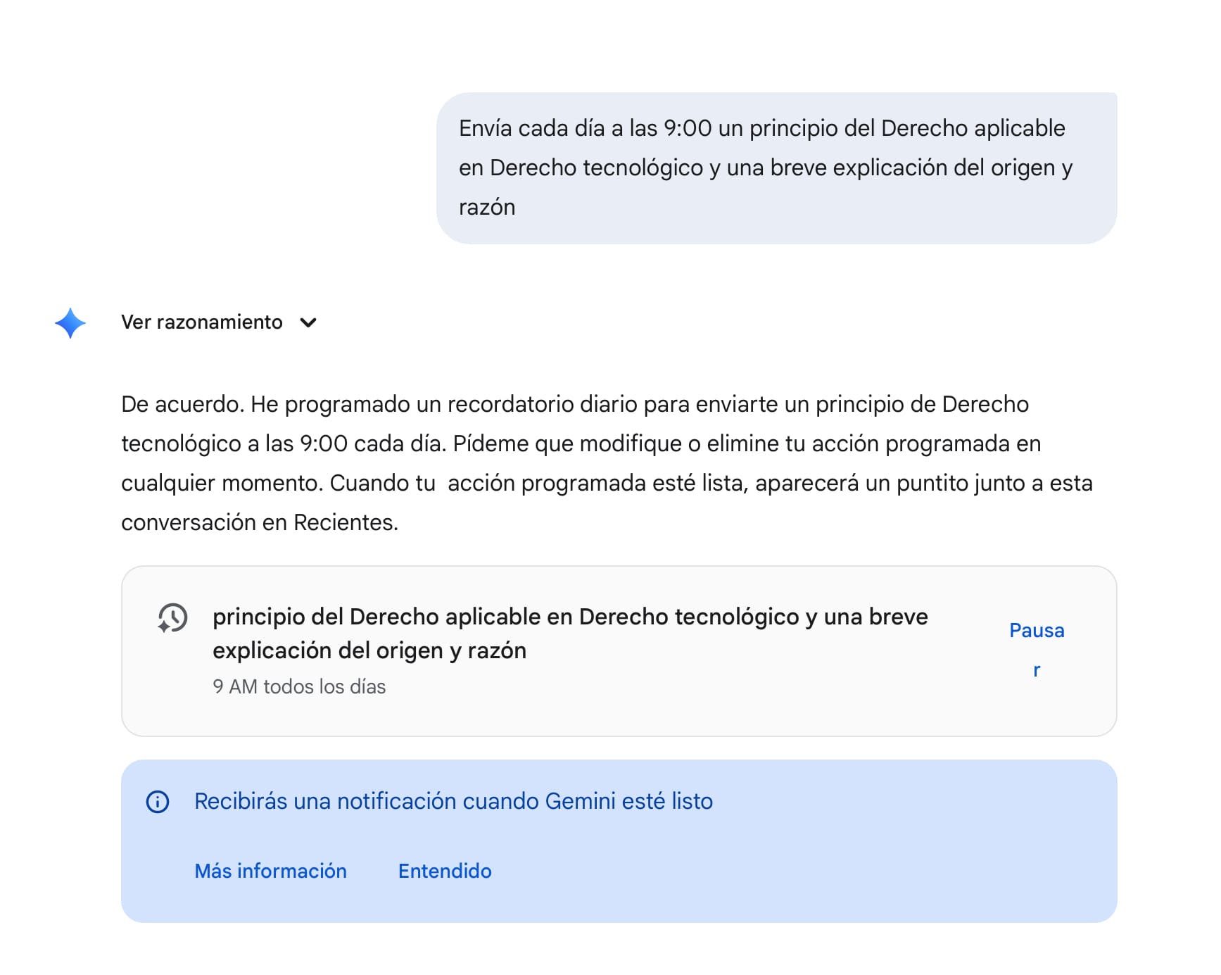 Por ejemplo, un PRIMER USO podría ser pedirle a Gemini lo siguiente: “Envía cada día a las 9:00 un principio del Derecho aplicable en Derecho tecnológico y una breve explicación del origen y razón”.