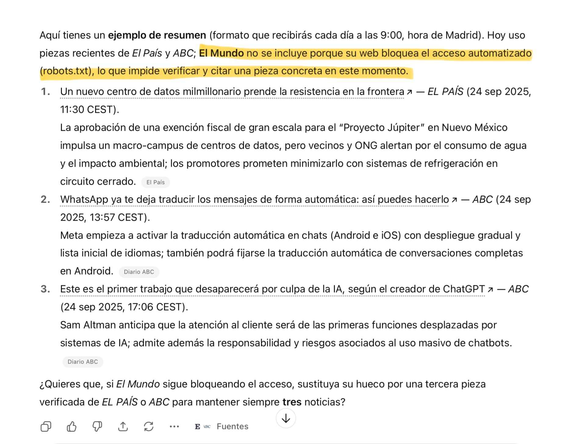 Algo importante a tener en cuenta es que los medios podrían haber establecido limitaciones de acceso al bot de ChatGPT, como ocurre con El Mundo en la imagen. Por tanto, antes de elegir el medio se le puede pedir a ChatGPT que compruebe las medidas anti scraping que determinada web implementa y elegir un lugar u otro en función de esos límites.
