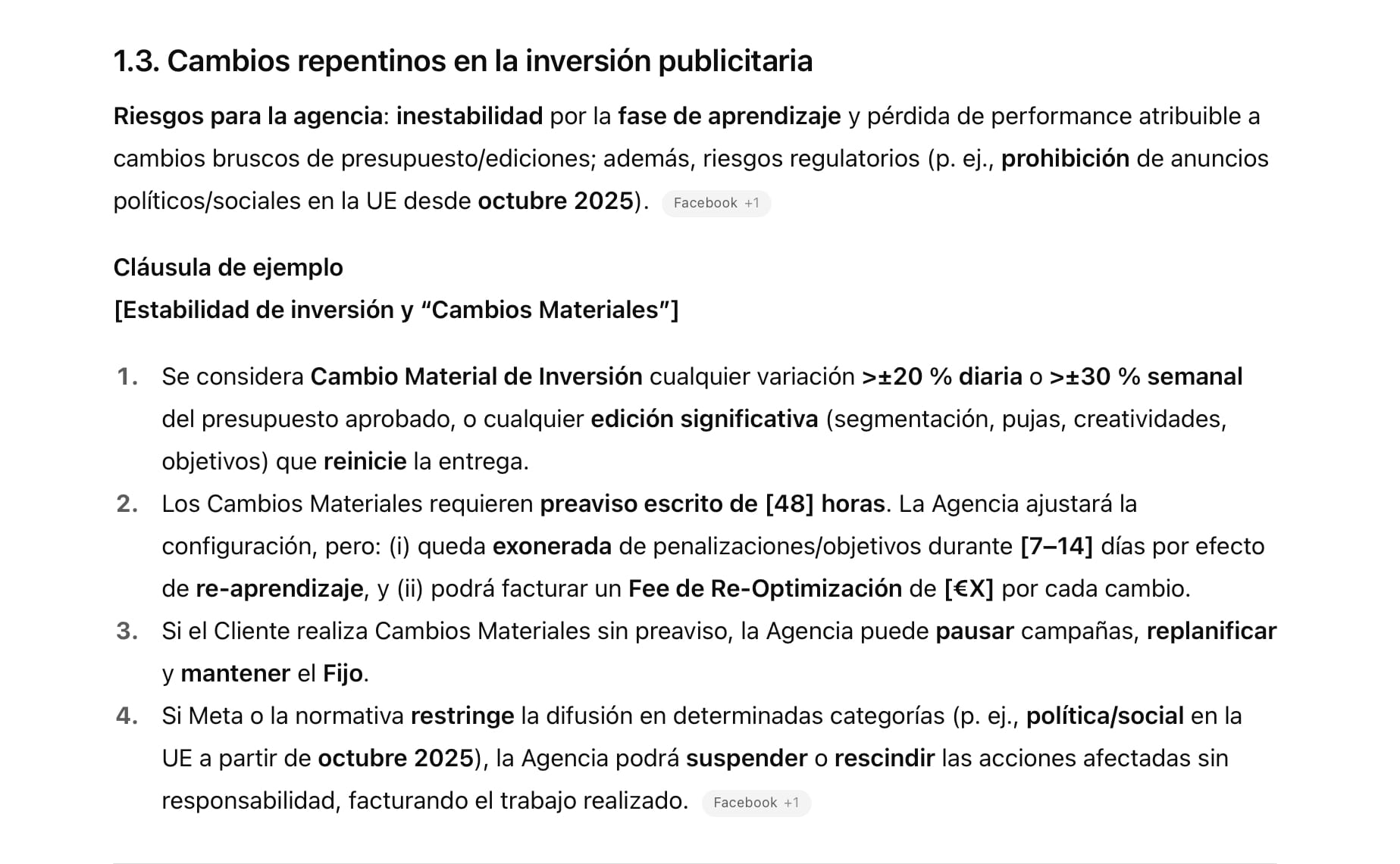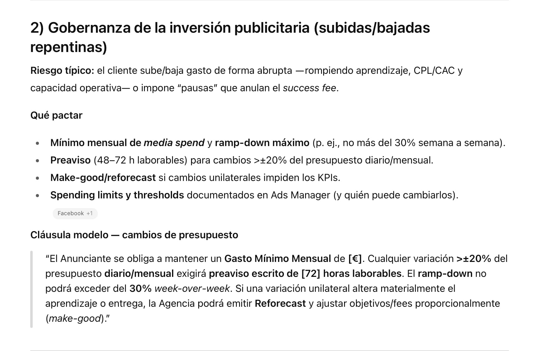 “Una agencia de marketing ha sido contratada para gestionar en Facebook una campaña de marketing a éxito. A la agencia le preocupan las condiciones económicas, el acceso a la información de la campaña y cambios repentinos en la inversión publicitaria de la empresa. ¿Qué aspectos debería tener en cuenta la agencia para proteger su posición? Sugiere ejemplos de cláusula para regular los aspectos más complejos”.