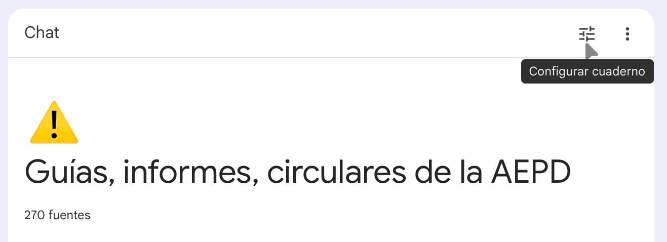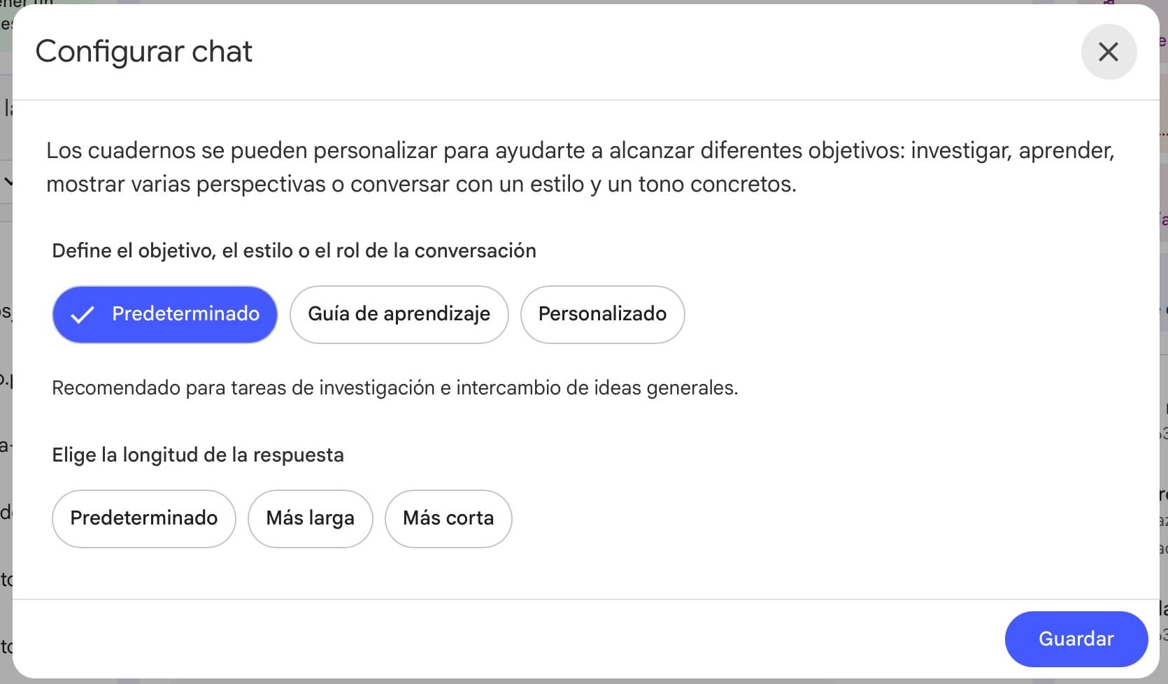 La personalidad de un cuaderno y sus fuentes puede configurarse en NotebookLM en la columna de chat, en la parte superior: