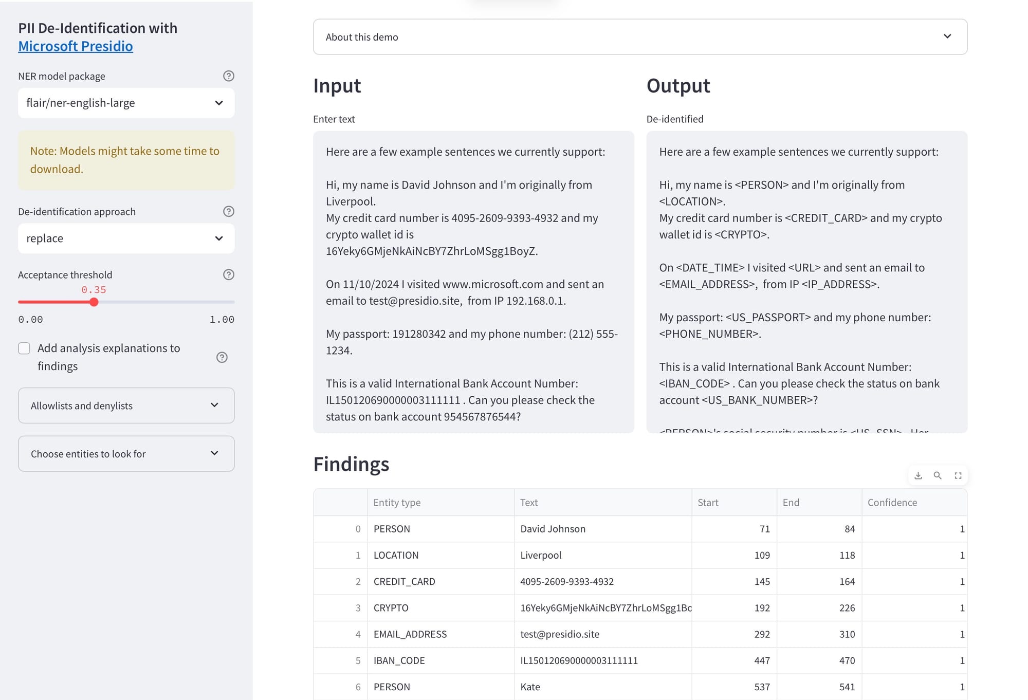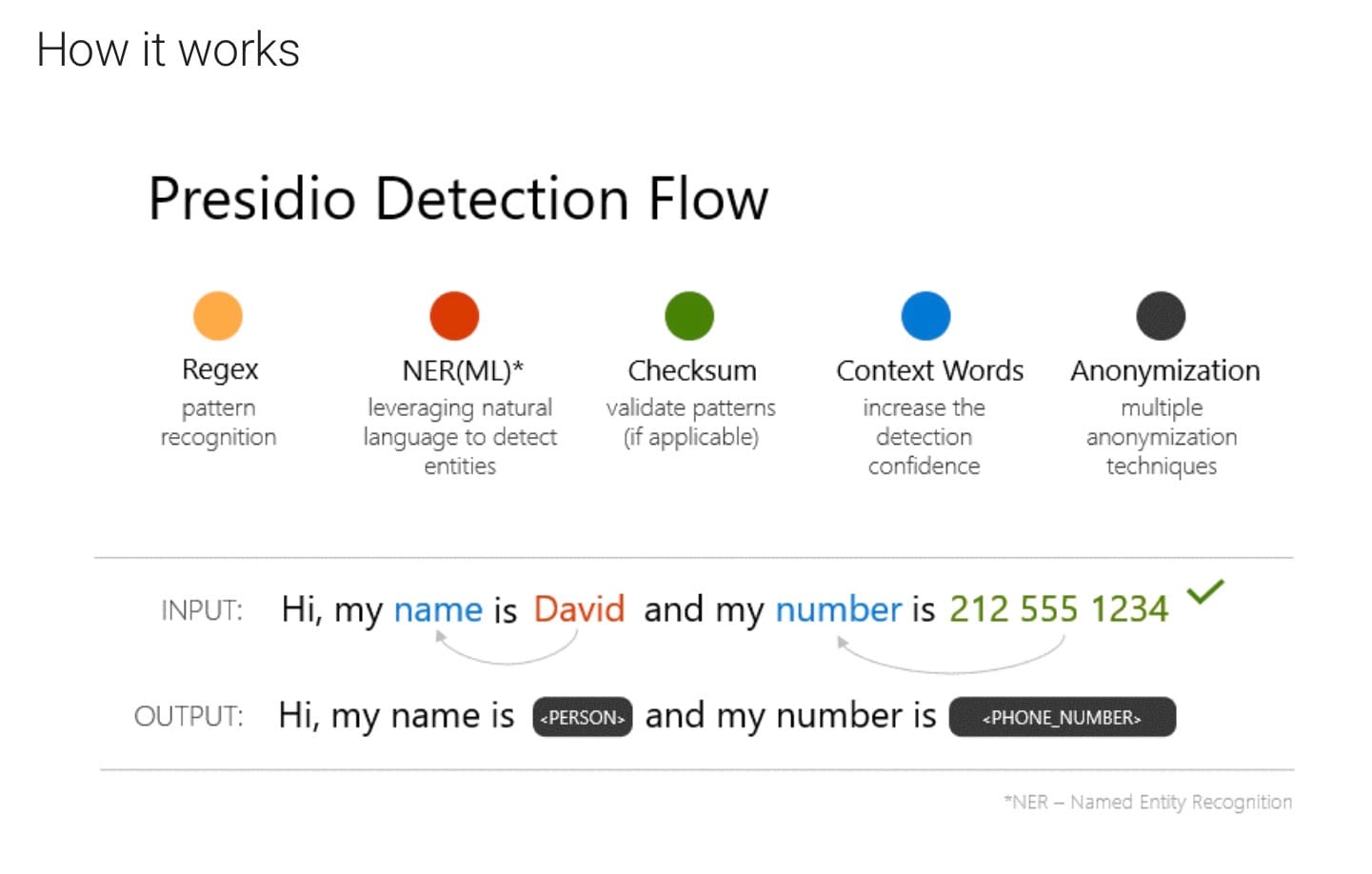 Presidio (en latín “protección”): “Ayuda a garantizar que los datos confidenciales se gestionen y gobiernen adecuadamente. Proporciona módulos rápidos de identificación y anonimización para entidades privadas en texto e imágenes como números de tarjetas de crédito, nombres, ubicaciones, números de seguridad social, billeteras bitcoin, números de teléfono, datos financieros y más”.