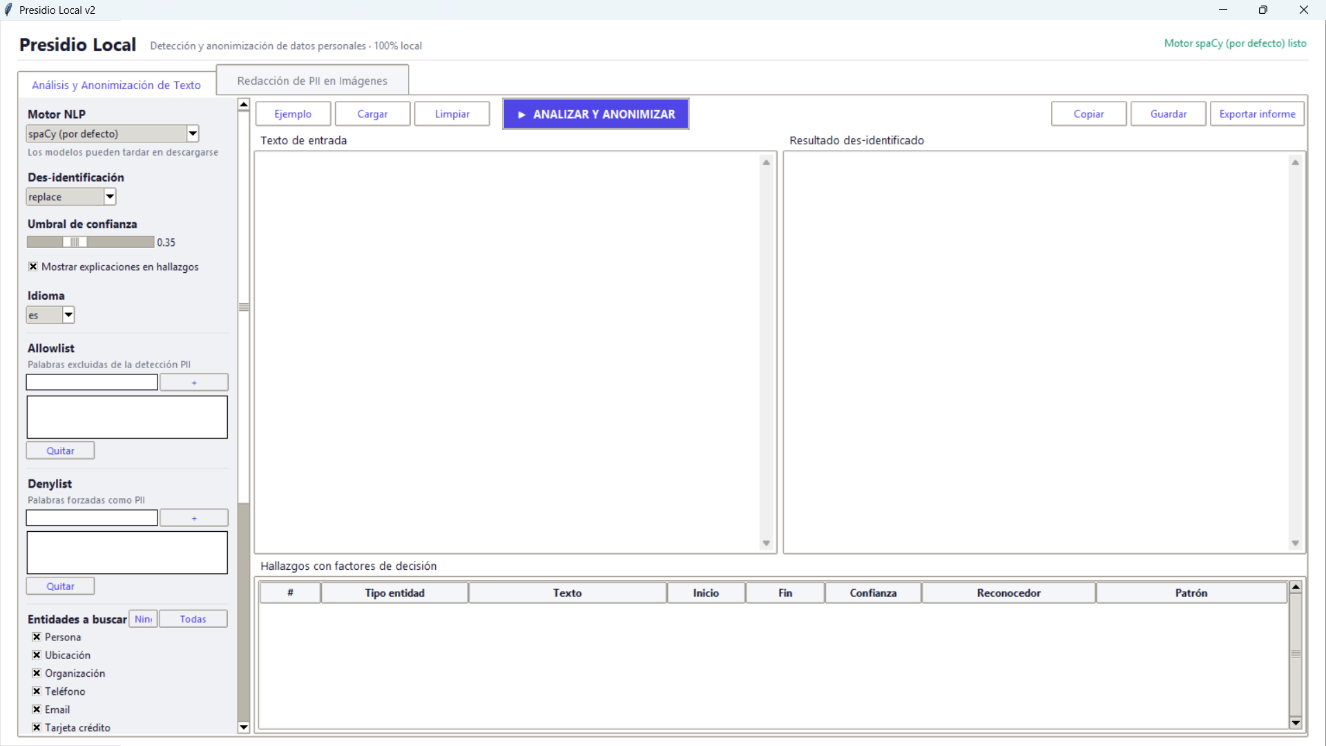 - Tres motores de anonimización, uno de ellos basado en “Transformers” que pueden ser elegidos según el caso (es lo único que se descarga de Internet al inicio).