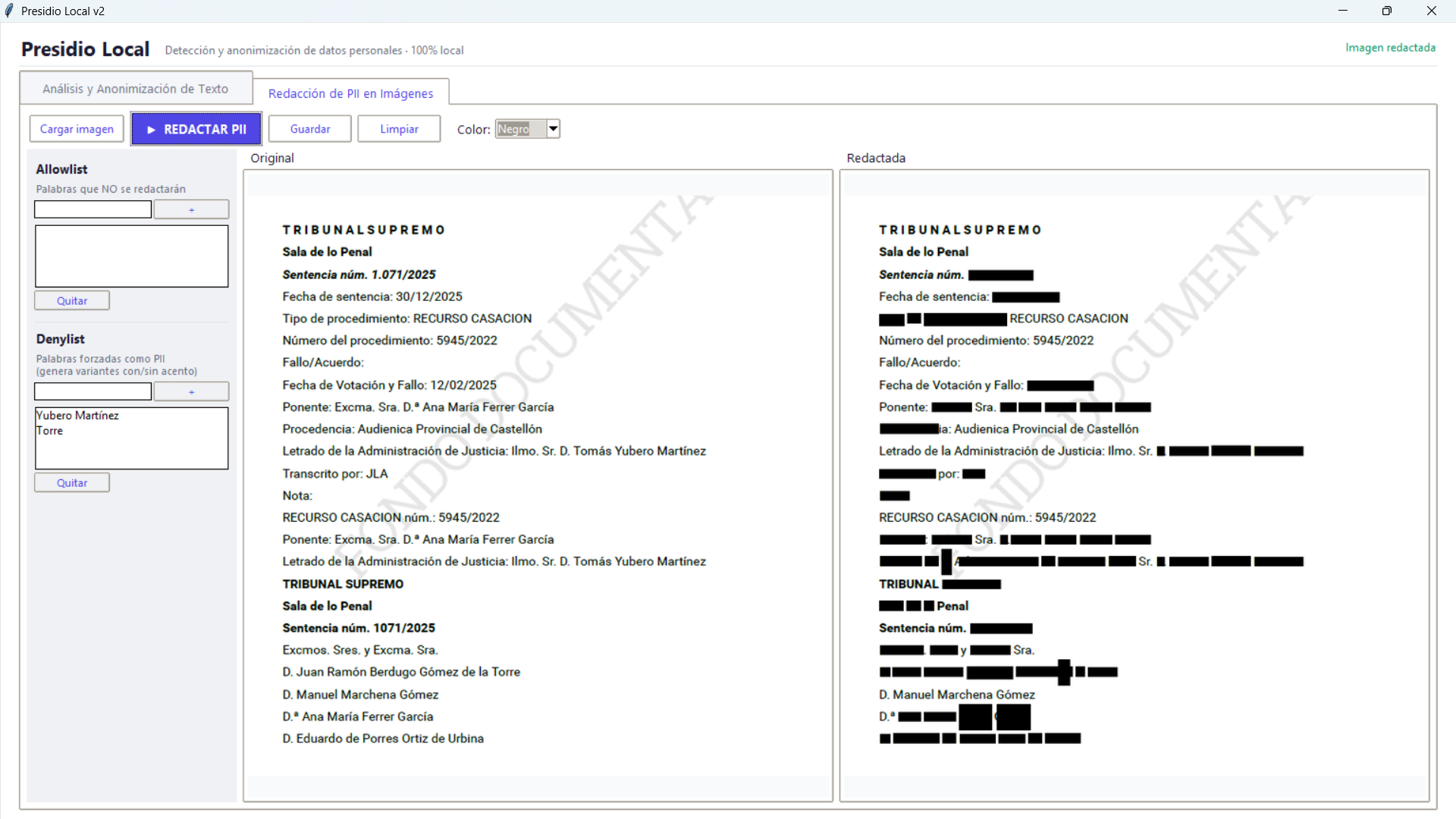 - La exportación a texto, JSON o PNG del contenido anonimizado.
