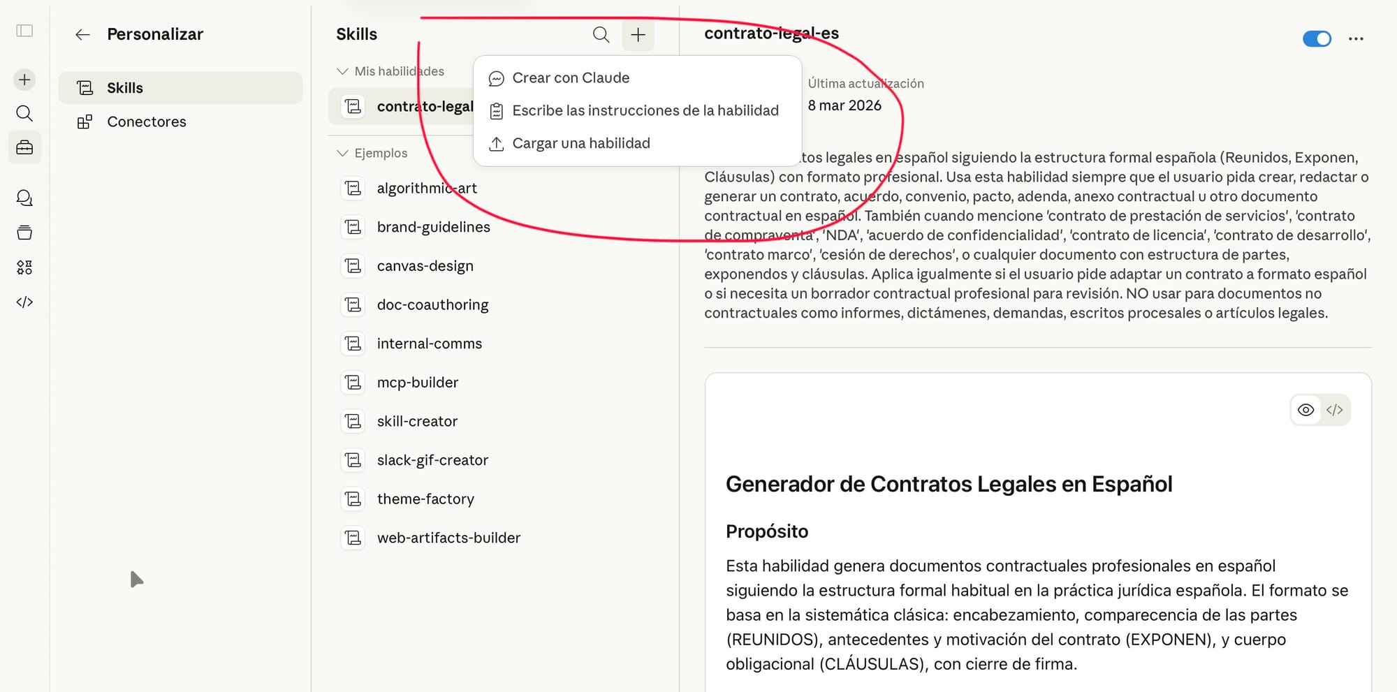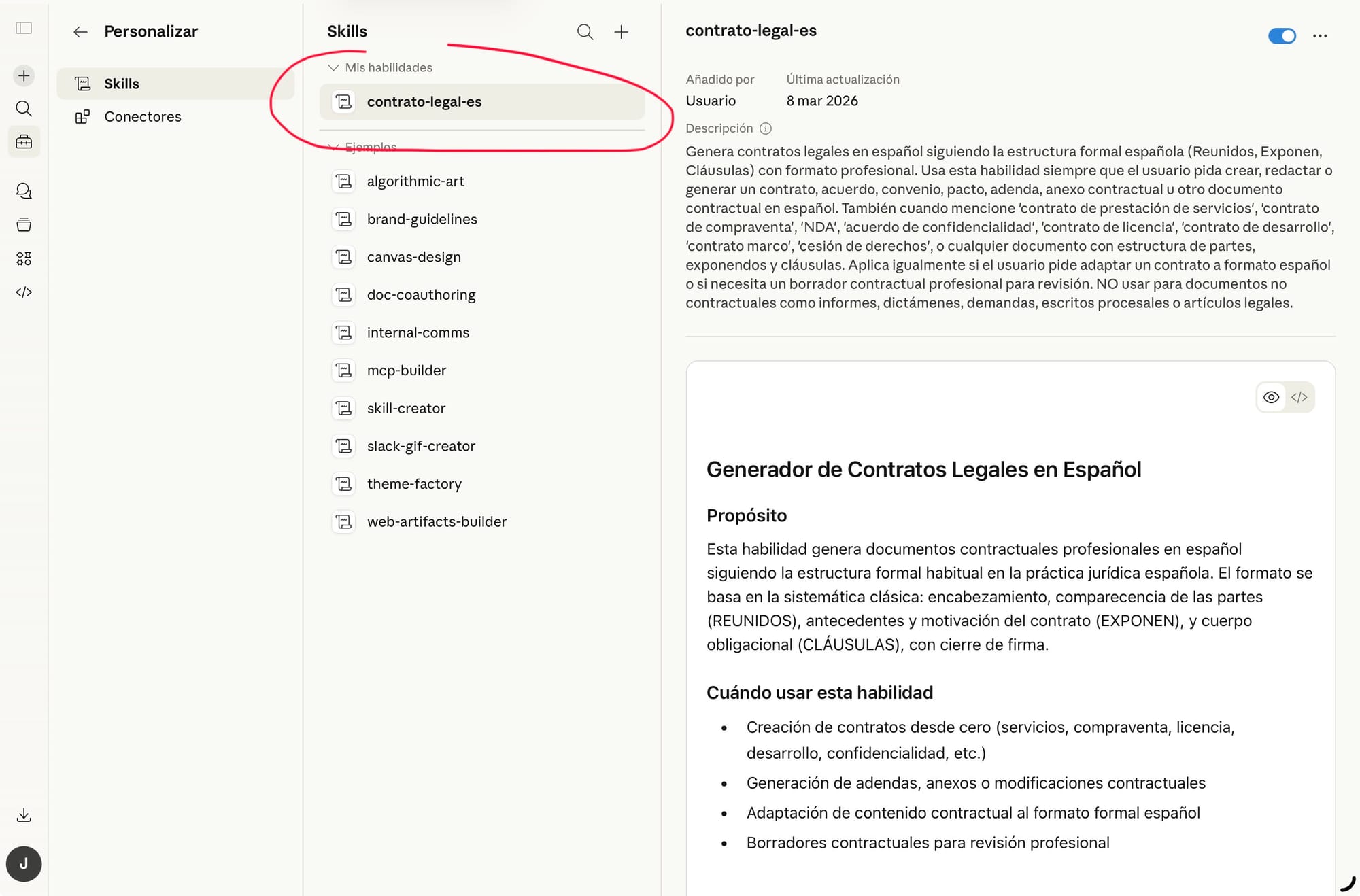Pongo un ejemplo propio de una skill mía llamada “contrato-legal-es”.