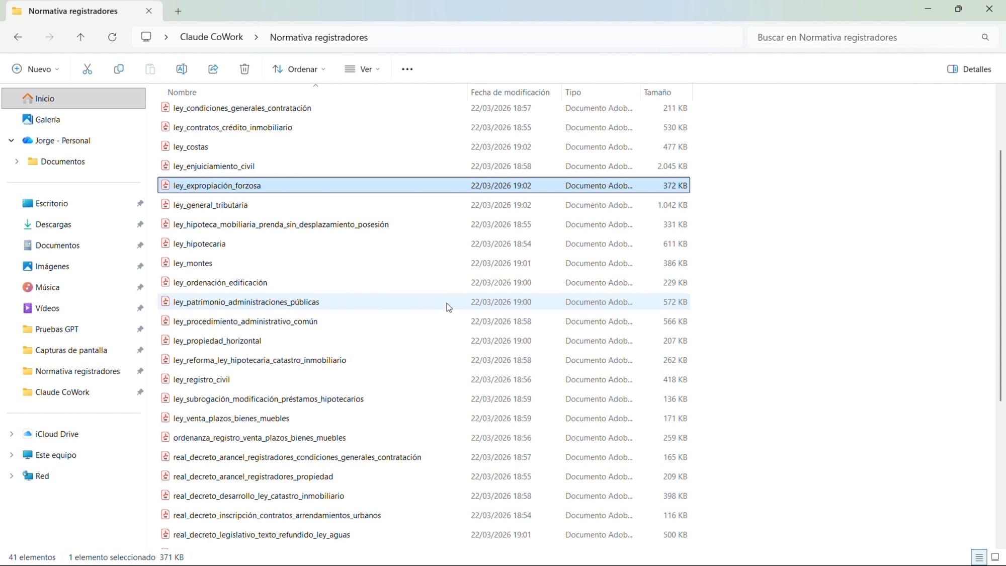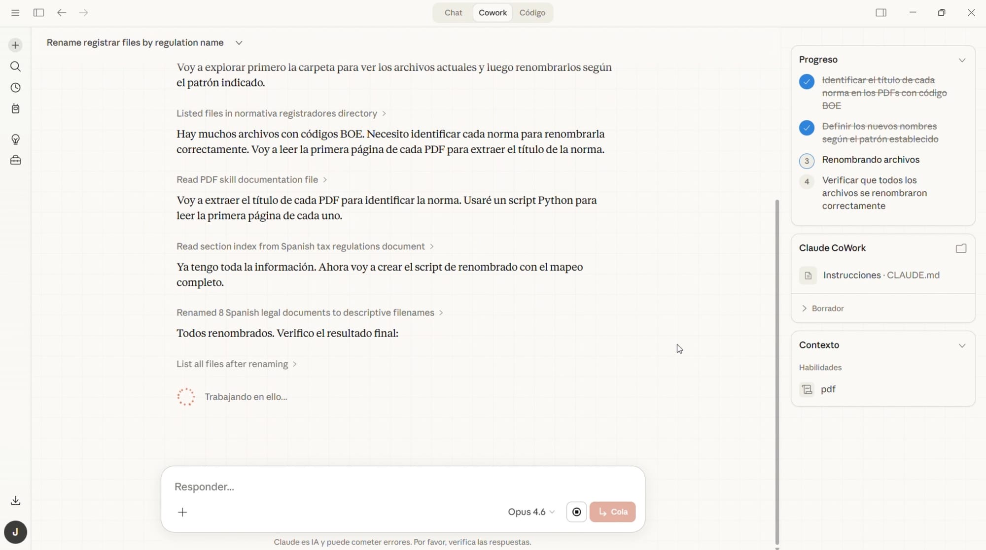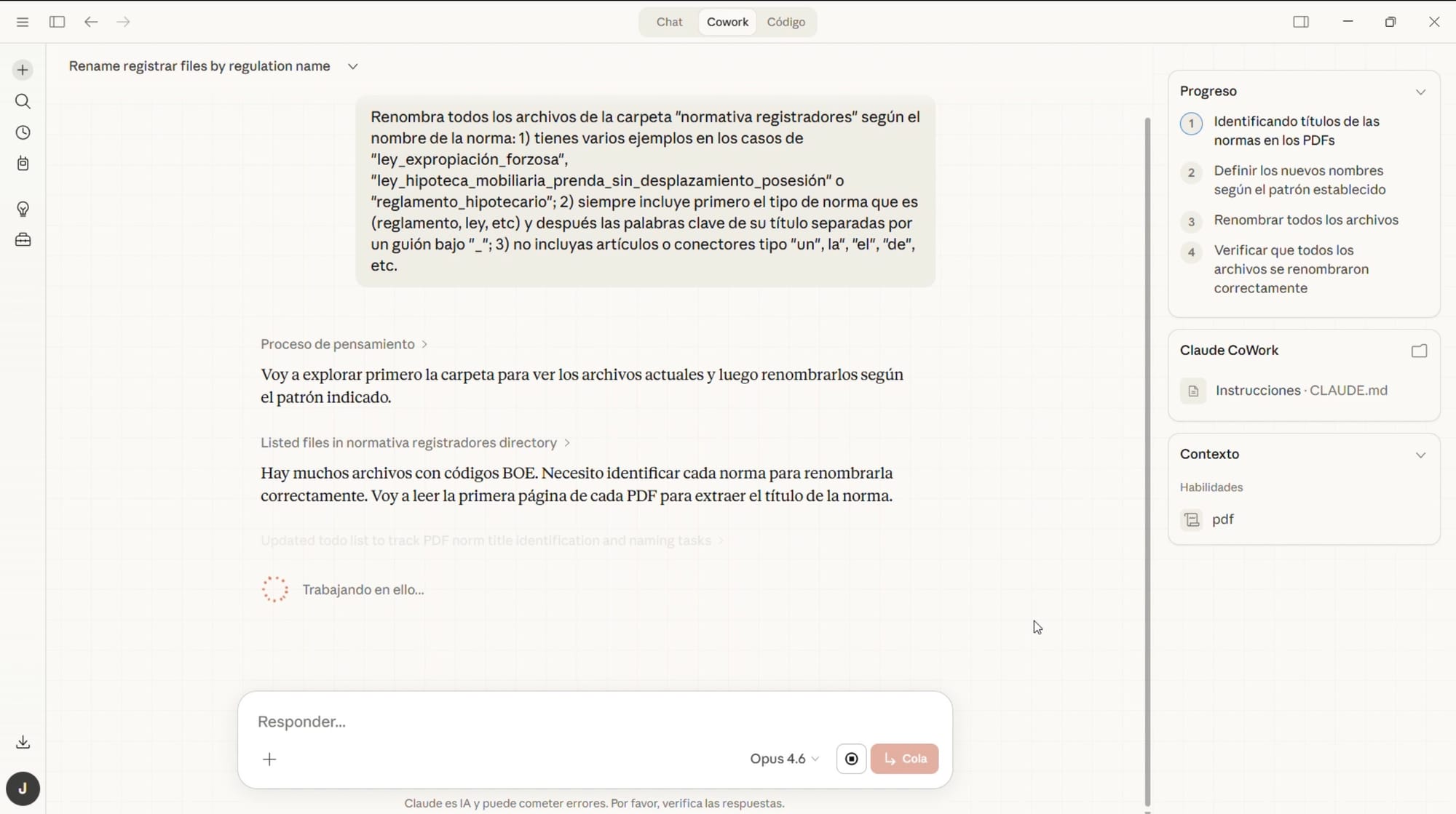 Pero Claude CoWork puede trabajar en carpetas de nuestro escritorio, reorganizarlas y renombrarlas. Puede hacerlo incluso en función de su contenido, por ejemplo lo que cada archivo indica en la primera página (para saber si es la ley hipotecaria, el reglamento o tantas otras normas).